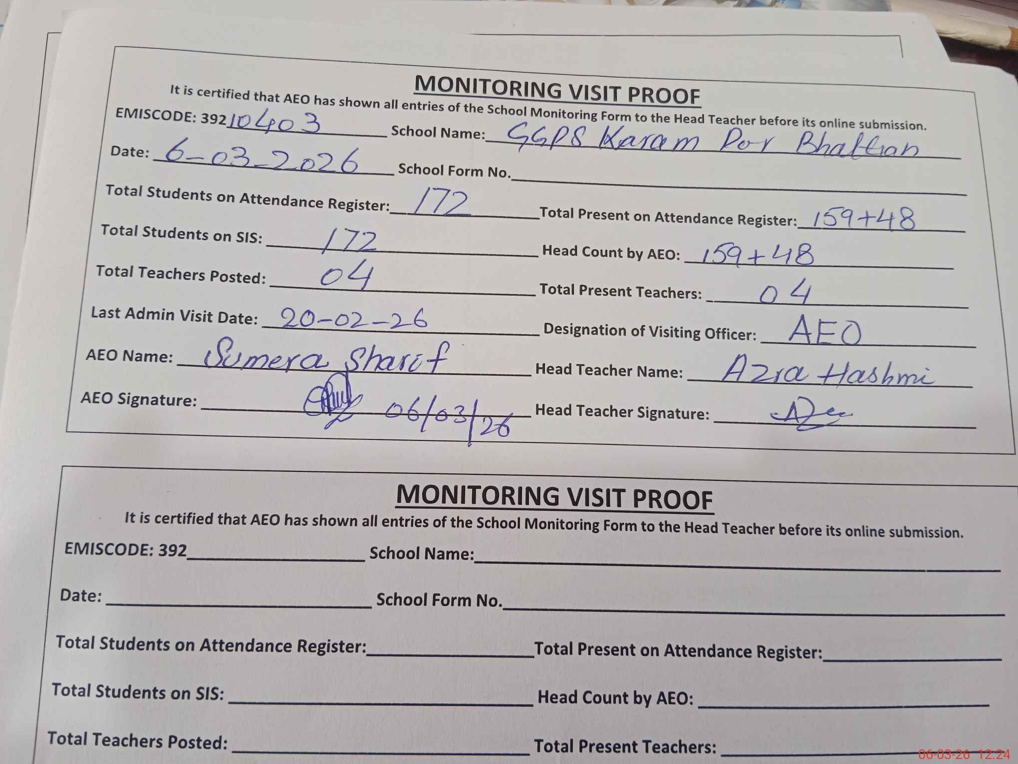 | Attendance Register | Head Teacher | MEA with School | Visit Proof |