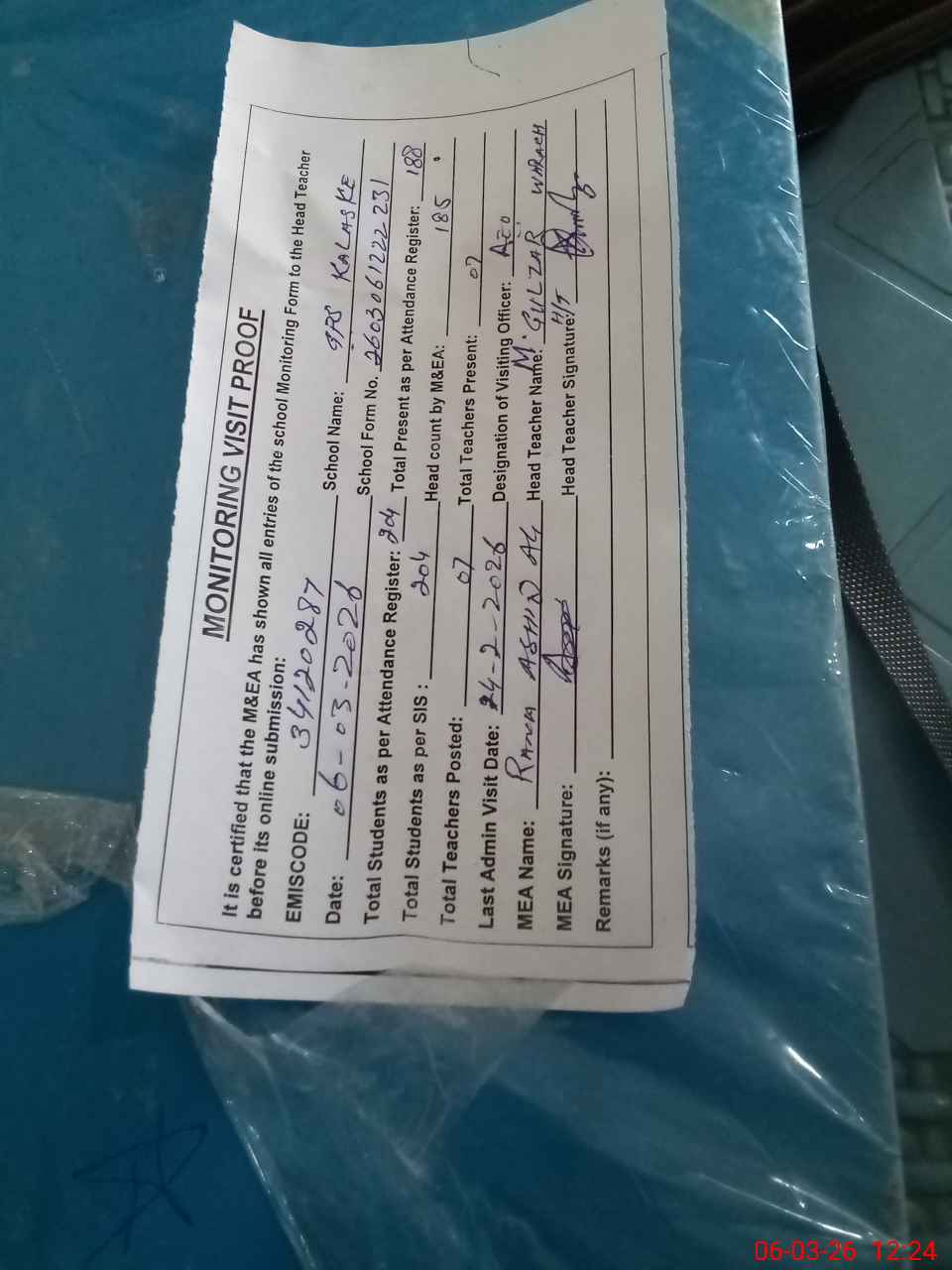 | Attendance Register | Head Teacher | MEA with School | Visit Proof |