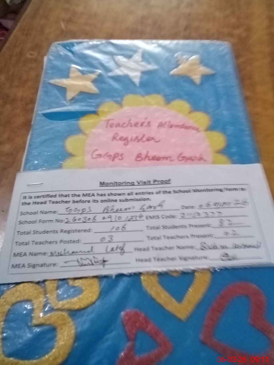 | Attendance Register | Head Teacher | MEA with School | Visit Proof |