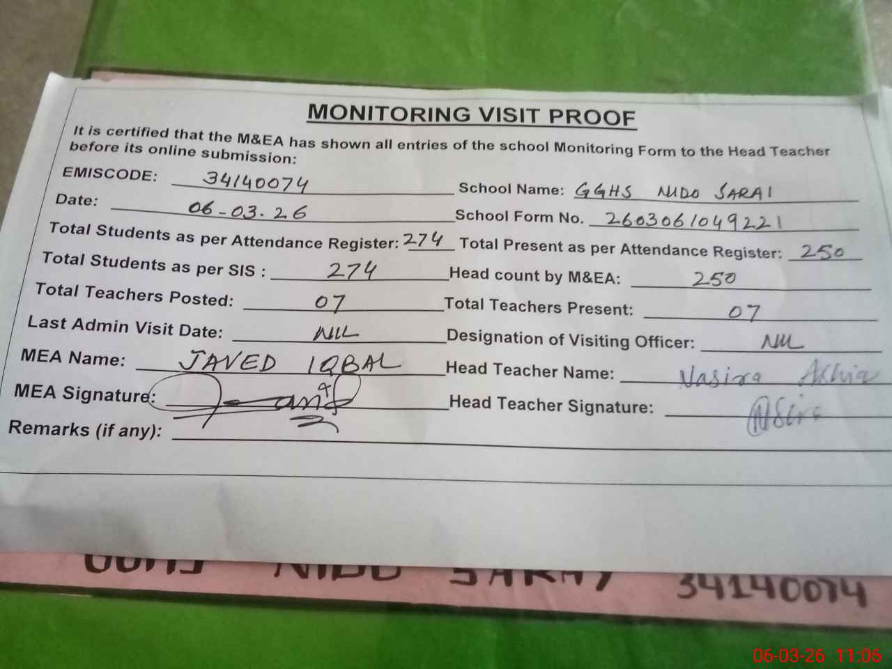 | Attendance Register | Head Teacher | MEA with School | Visit Proof |
