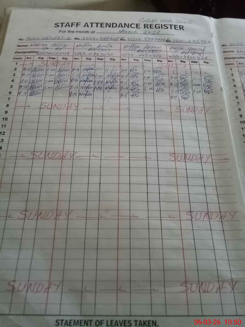 | CNIC | Full Name | Designation | R/C | Absence During Last Calender Month |