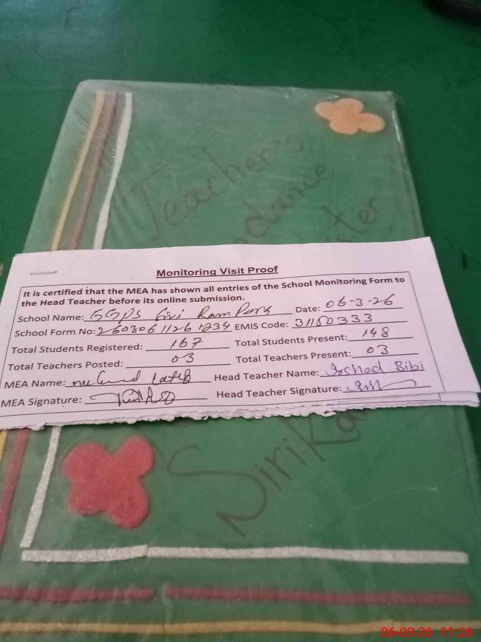 | Attendance Register | Head Teacher | MEA with School | Visit Proof |