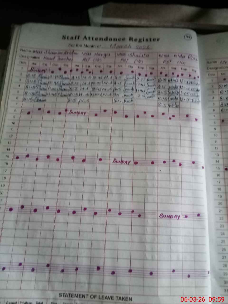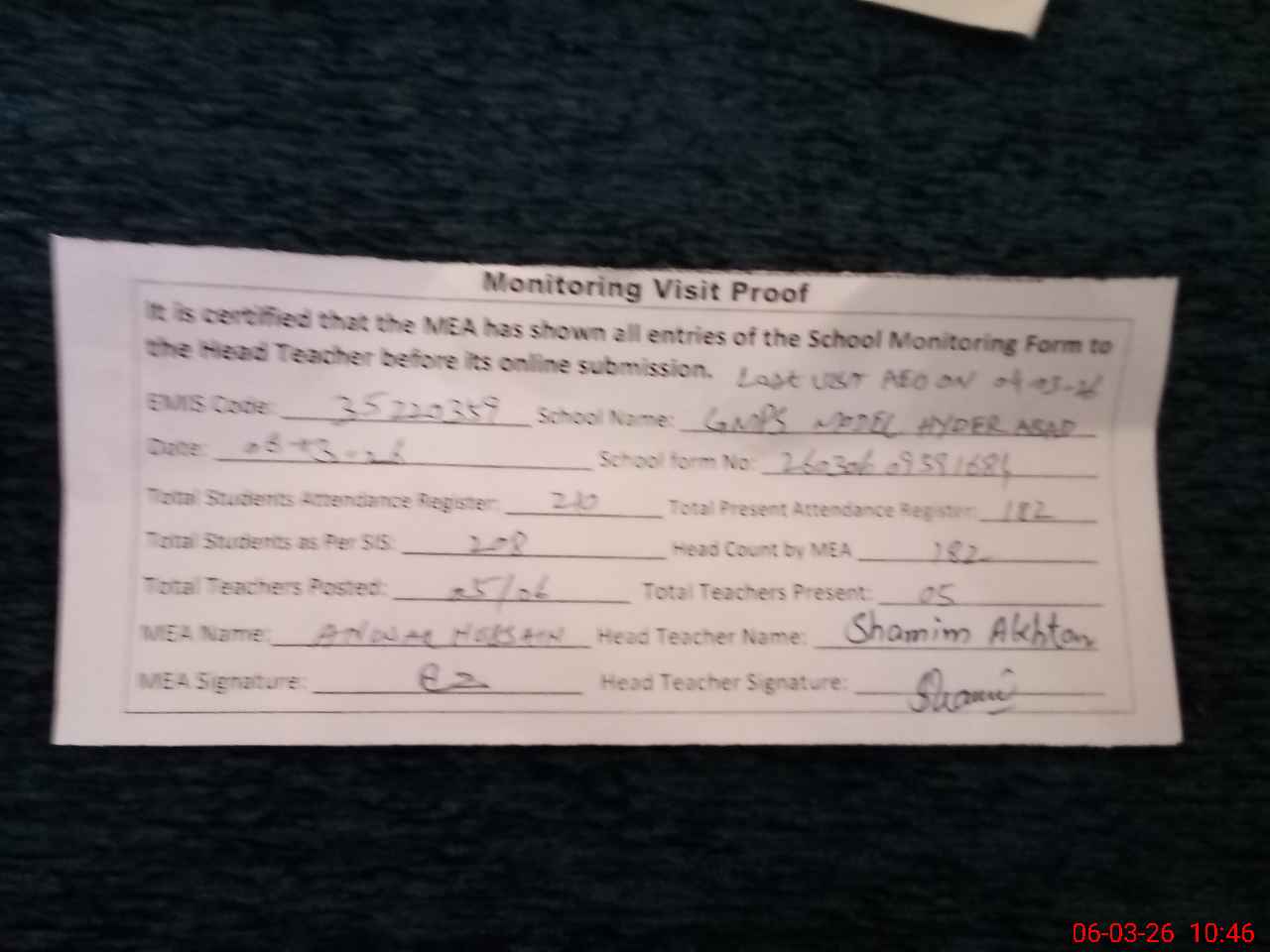 | Remarks (Use Separate Page if Required): School consist two camps secondary camp consist 02 class Room and 02 wash room no source of water in secondary camp 40 student in said camp boundary wall height of this camp also very low moreover razor wire missing Main Camp boundary wall uplift work under progress 06 class dangerous not used for teaching remaining also required white wash and minor work 03 classes sitting open air due to shortage of Class Room 04 Wash Room nonfunctional out of 06 Humna Sattar PST removed from service wef 15 August 2024 Order No 2615 dated 18 November 2025 but her name still available in Teacher list in MEA tab | |||||