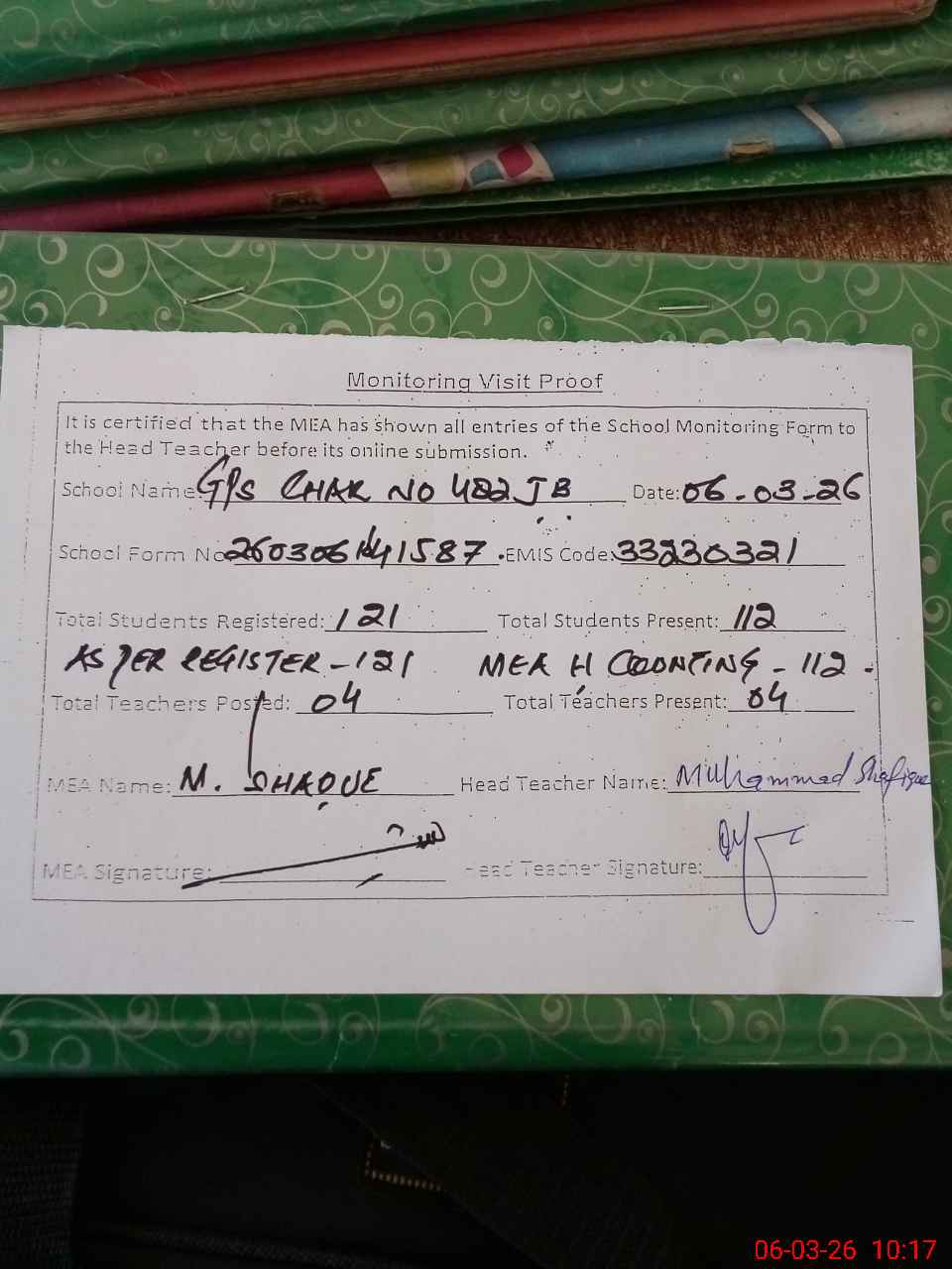 | Attendance Register | Head Teacher | MEA with School | Visit Proof |
