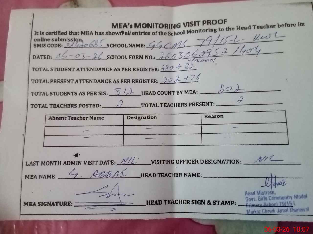 | Attendance Register | Head Teacher | MEA with School | Visit Proof |