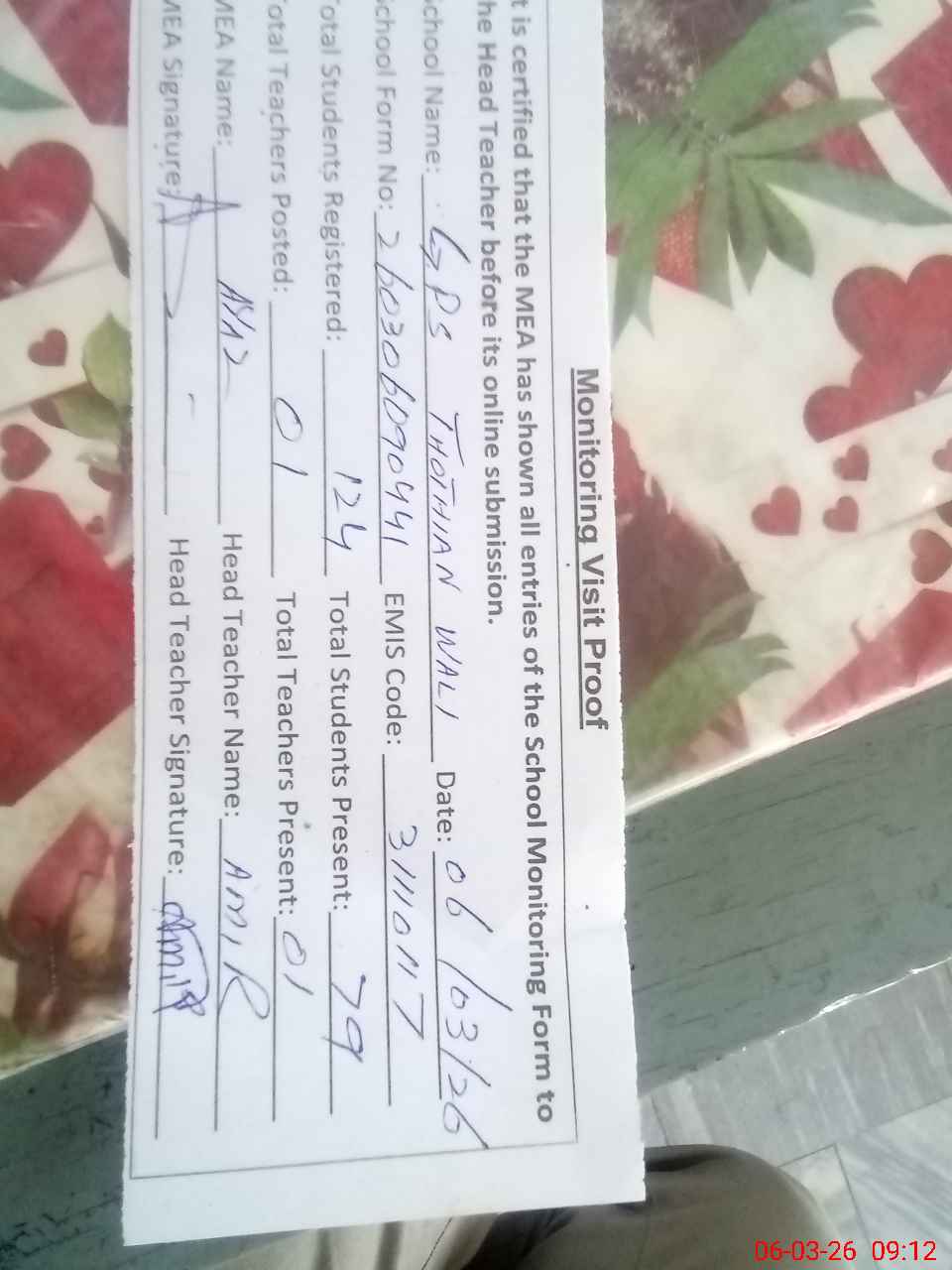 | Attendance Register | Head Teacher | MEA with School | Visit Proof |