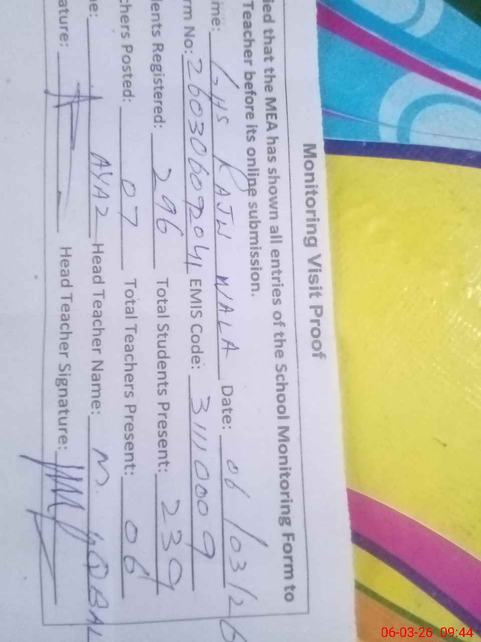 | Attendance Register | Head Teacher | MEA with School | Visit Proof |