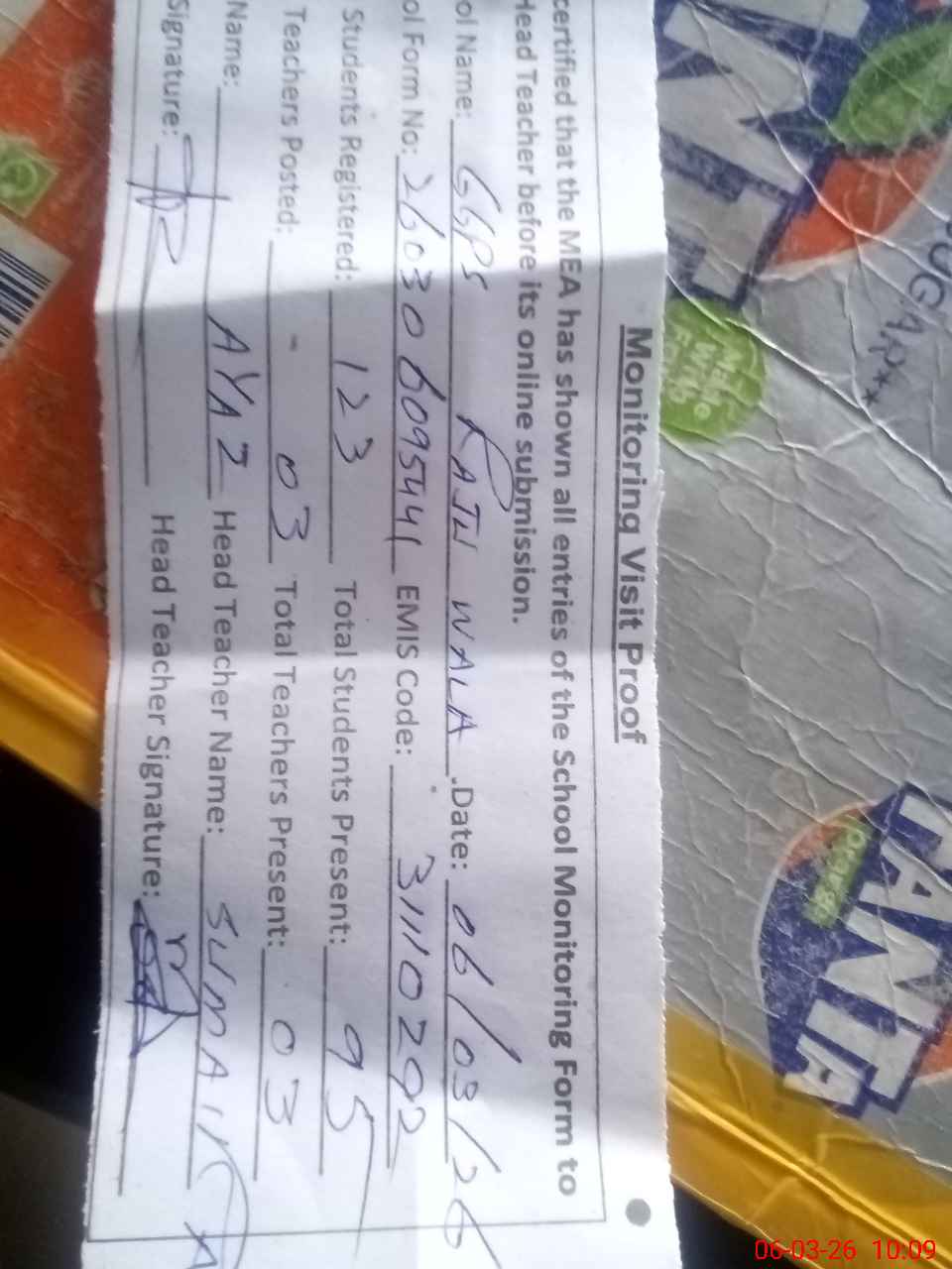 | Attendance Register | Head Teacher | MEA with School | Visit Proof |