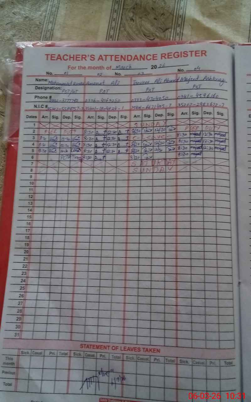 | Name: Am**** Al**** Designation: (School Headmaster's/Headmistress's) PTC/JV Phone/Cell Number: 03**** |