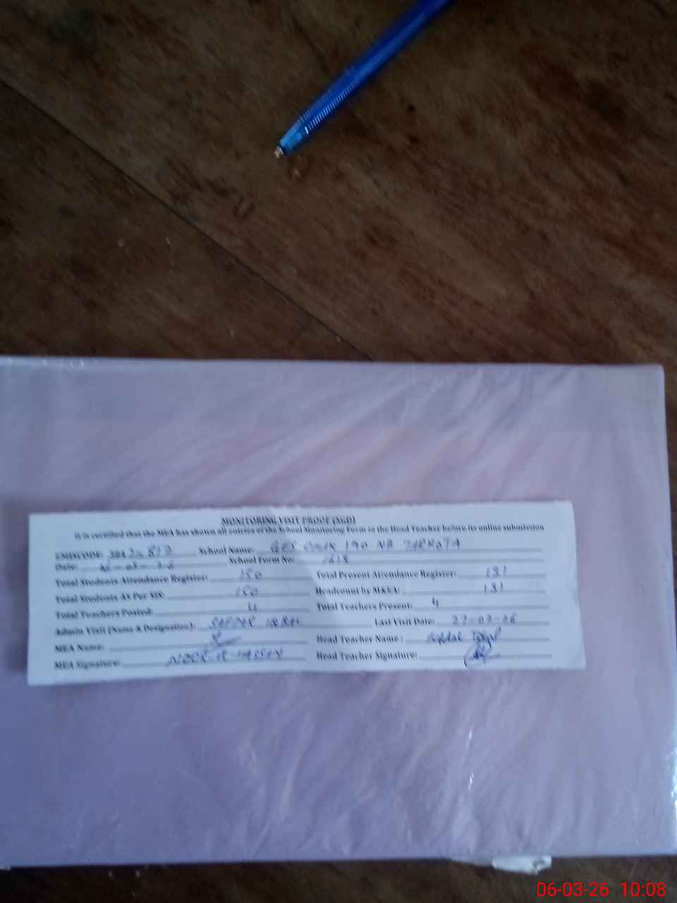 | Attendance Register | Head Teacher | MEA with School | Visit Proof |