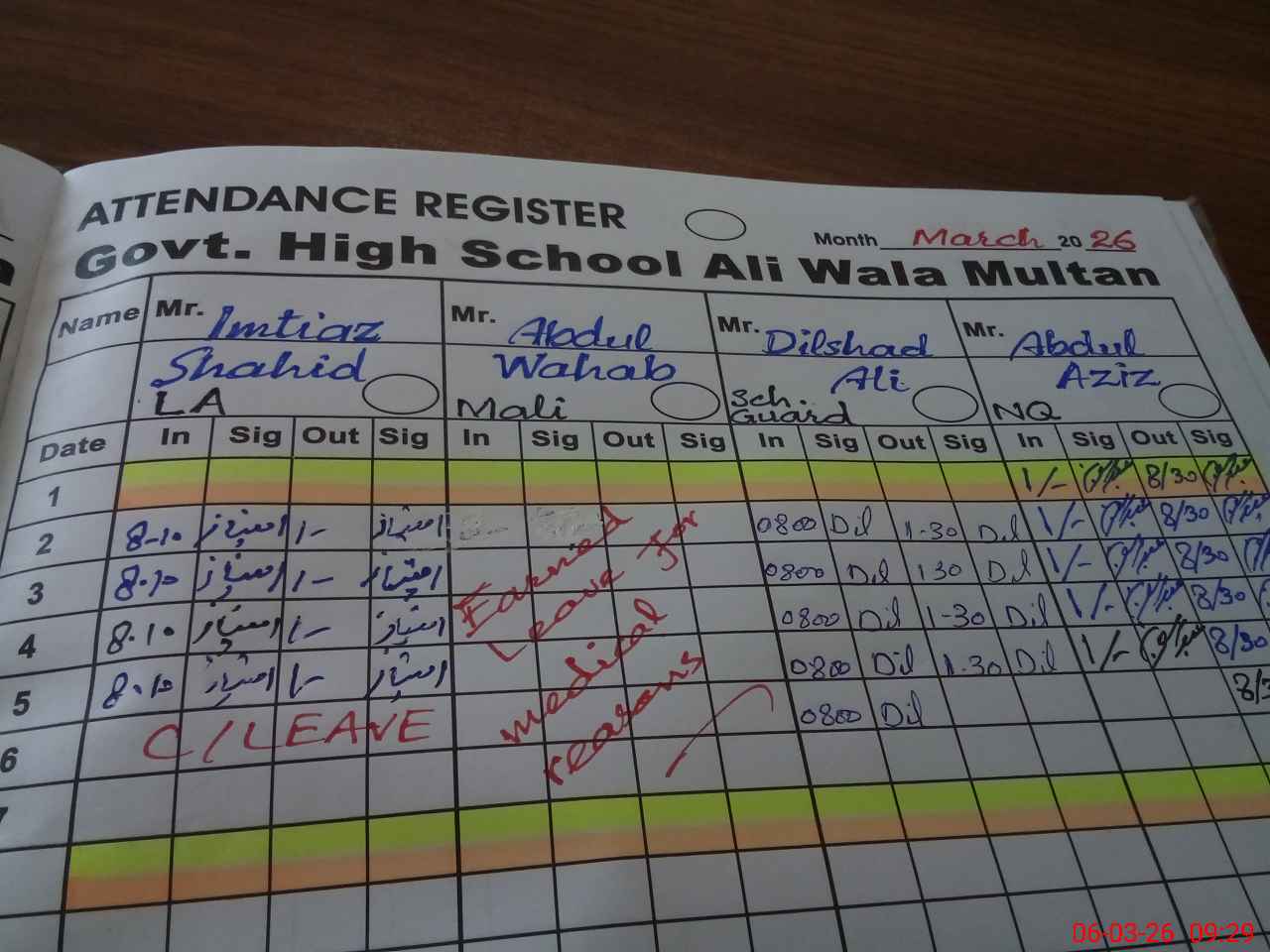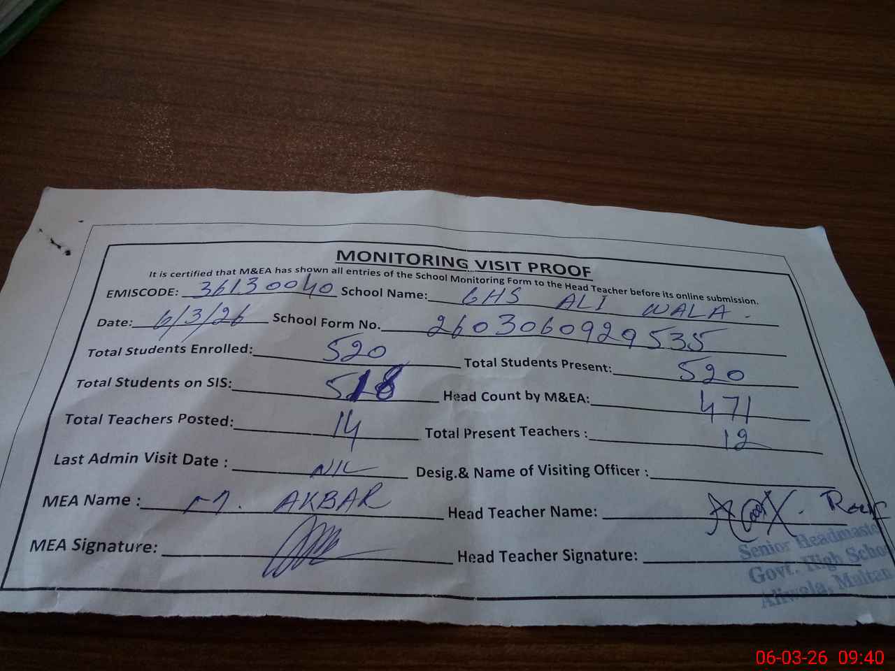 | EMIS Code: 36130040 | Name of School: GHS ALI WALA MULTAN | |||