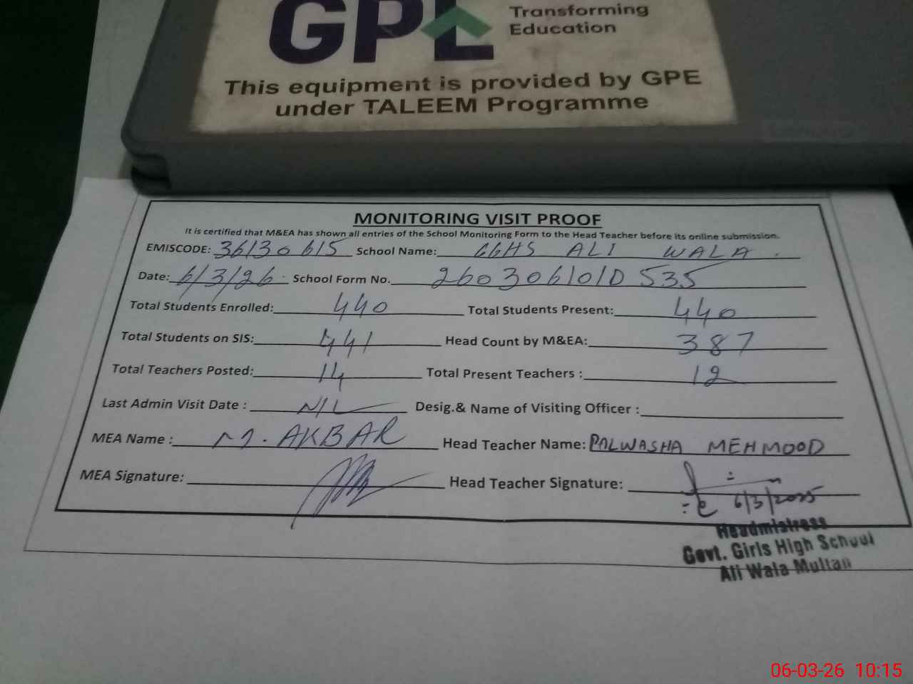 | EMIS Code: 36130615 | Name of School: GGHS ALI WALA MULTAN | |||