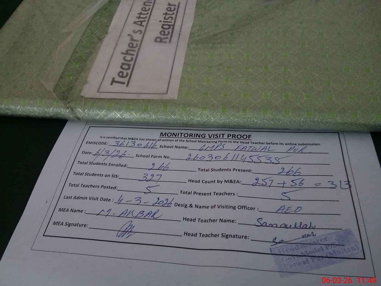 | Attendance Register | Head Teacher | MEA with School | Visit Proof |