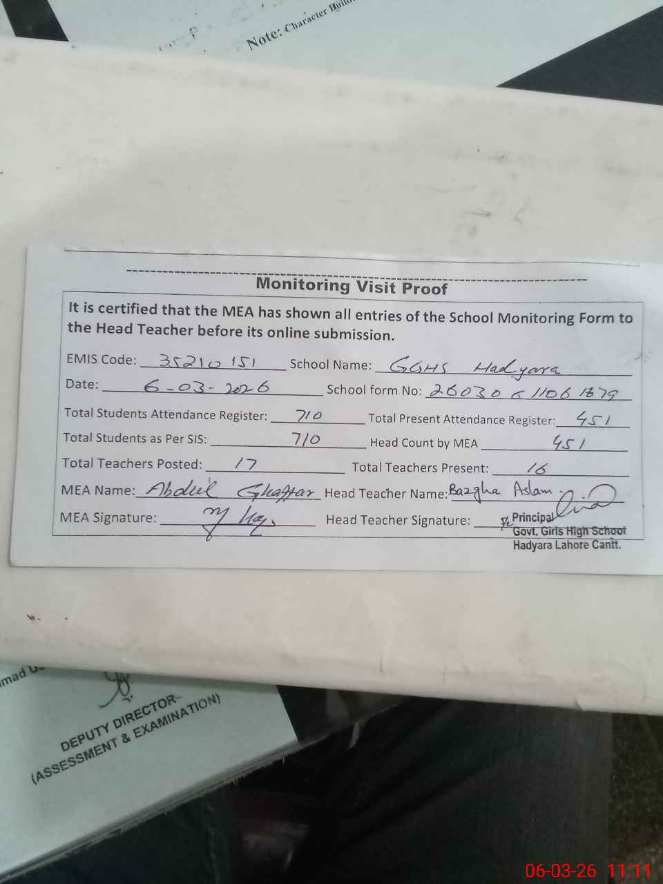 | Certified that this School was Inspected by the Undersigned MEA/DMO Today and the Information Stated Above is as Per Record. | |||||