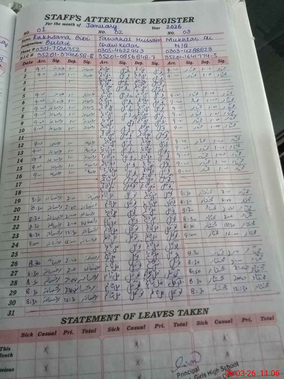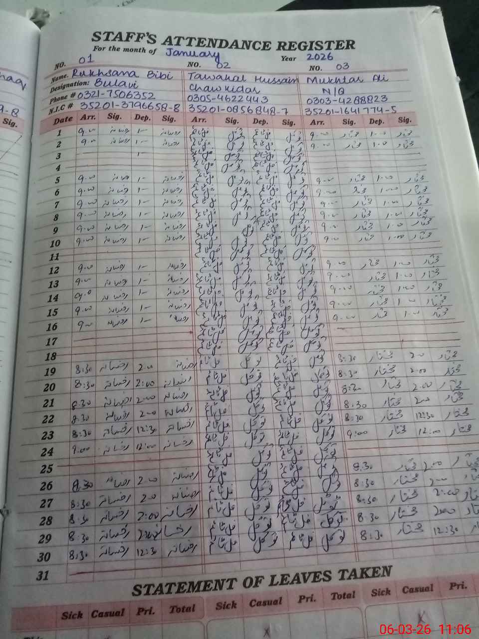 | CNIC | Full Name | Designation | R/C | Absence during last cal. month |