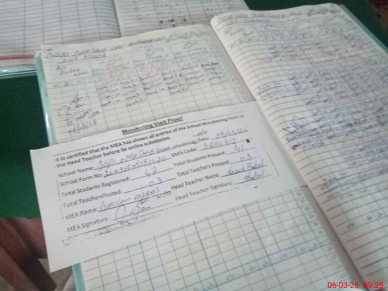 | Attendance Register | Head Teacher | MEA with School | Visit Proof |