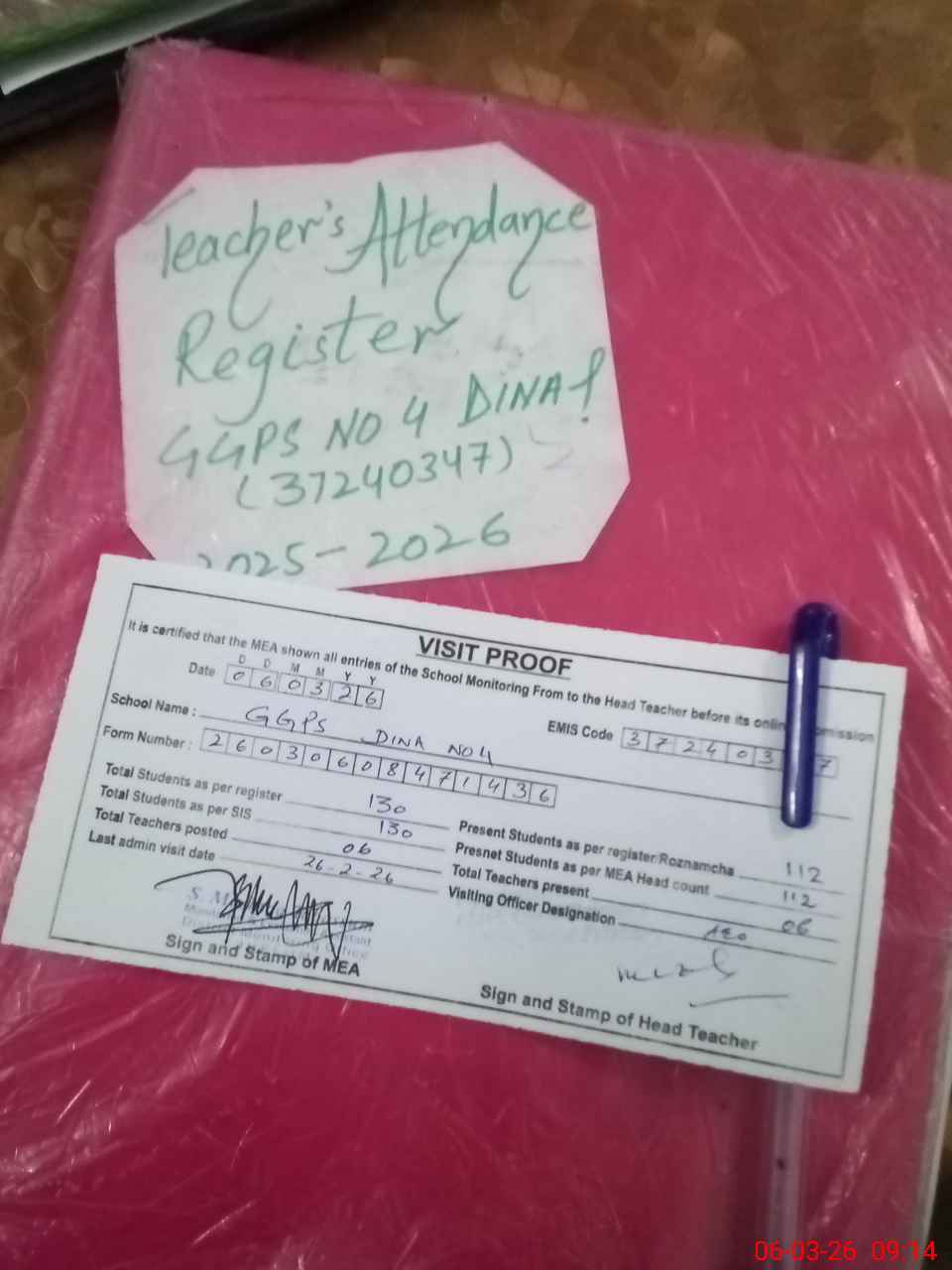 | Attendance Register | Head Teacher | MEA with School | Visit Proof |