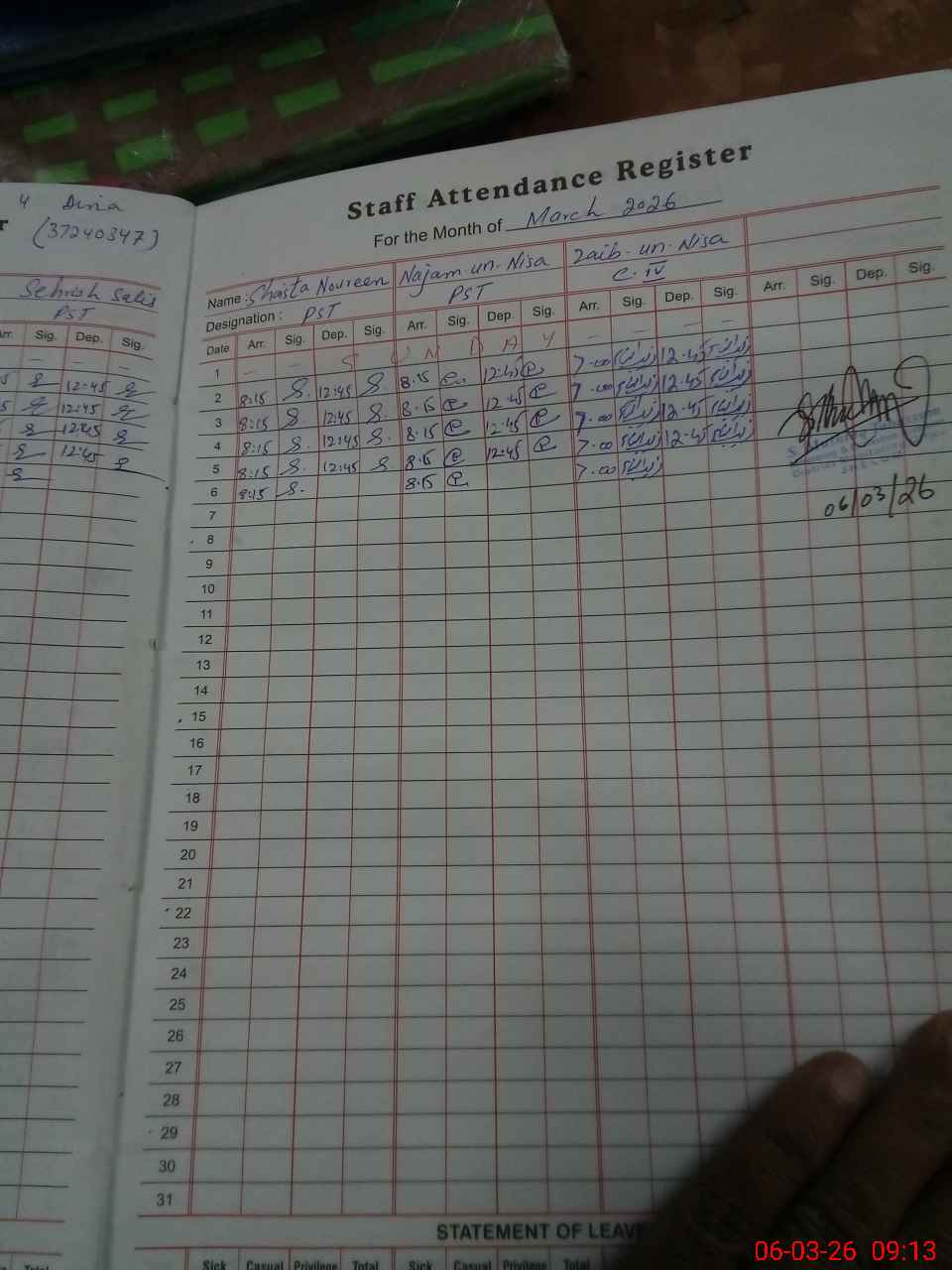 | Remarks (Use Separate Page if Required): HT Salma Bibi is on exam training in GGHS Dina. | |||||