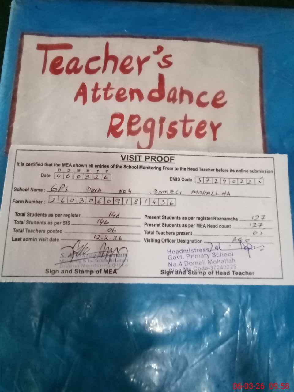 | Attendance Register | Head Teacher | MEA with School | Visit Proof |
