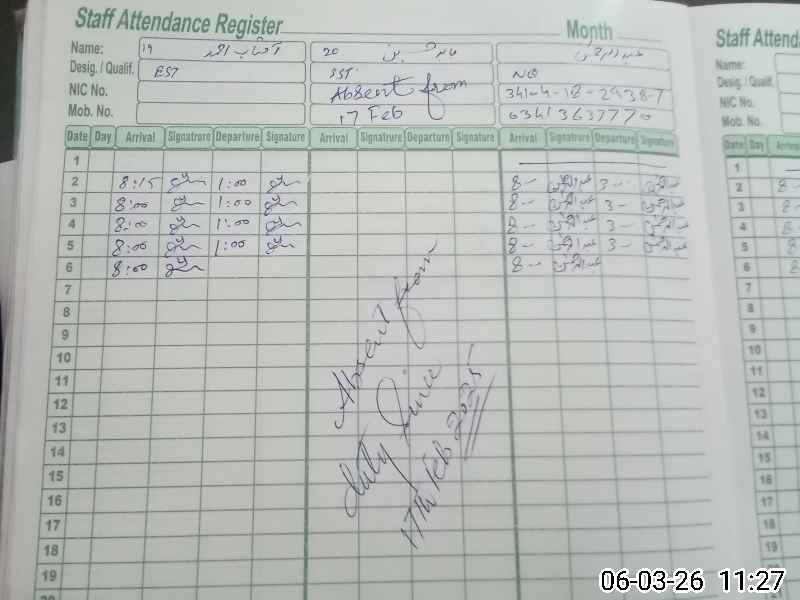 | 34**** | Ba**** Hu**** | SSE (Arabic) | Contract | 0 | 0 | 0 | 0 | 0 | 0 | 0 | 0 | 0 | Absent (Un-Authorized) |