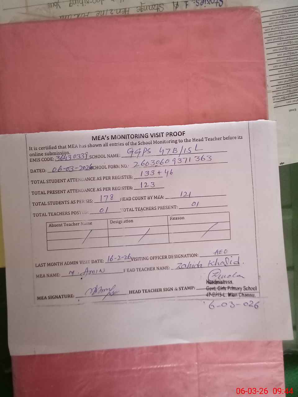 | Attendance Register | Head Teacher | MEA with School | Visit Proof |