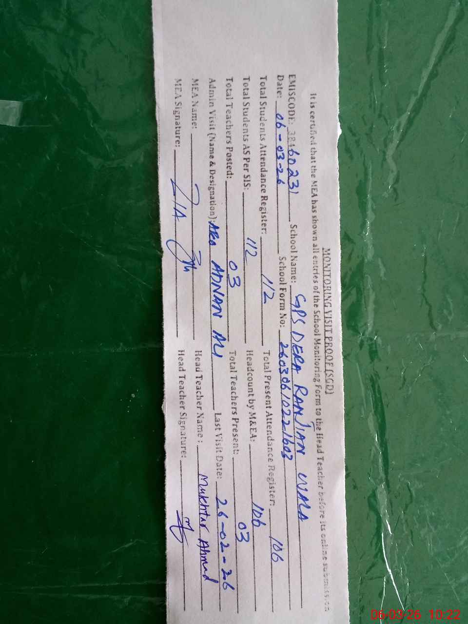 | Attendance Register | Head Teacher | MEA with School | Visit Proof |