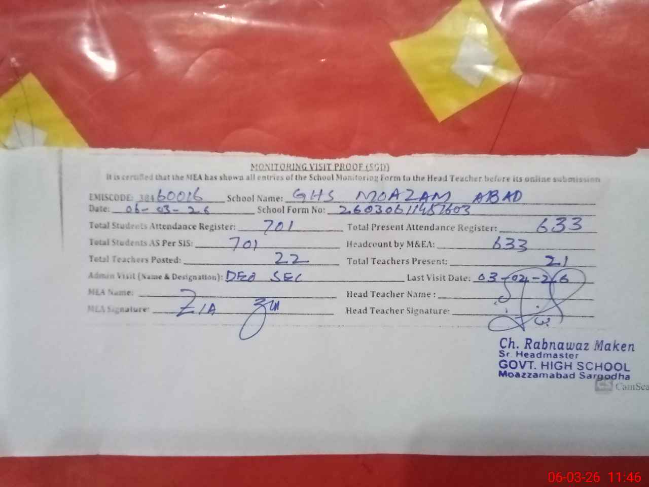 | Attendance Register | Head Teacher | MEA with School | Visit Proof |