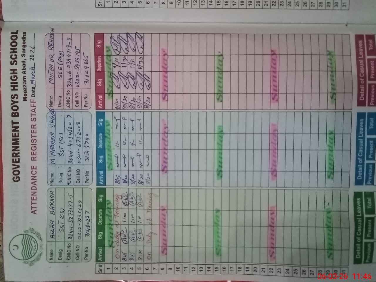 | CNIC | Full Name | Designation | R/C | Absence During Last Calender Month |
