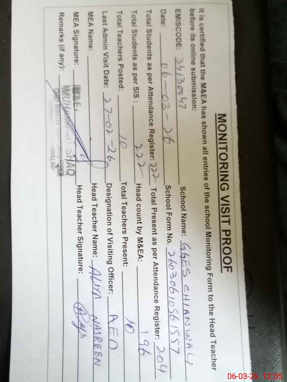 | EMIS Code: 34130047 | Name of School: GGES CHIANWALI GHARBI | |||