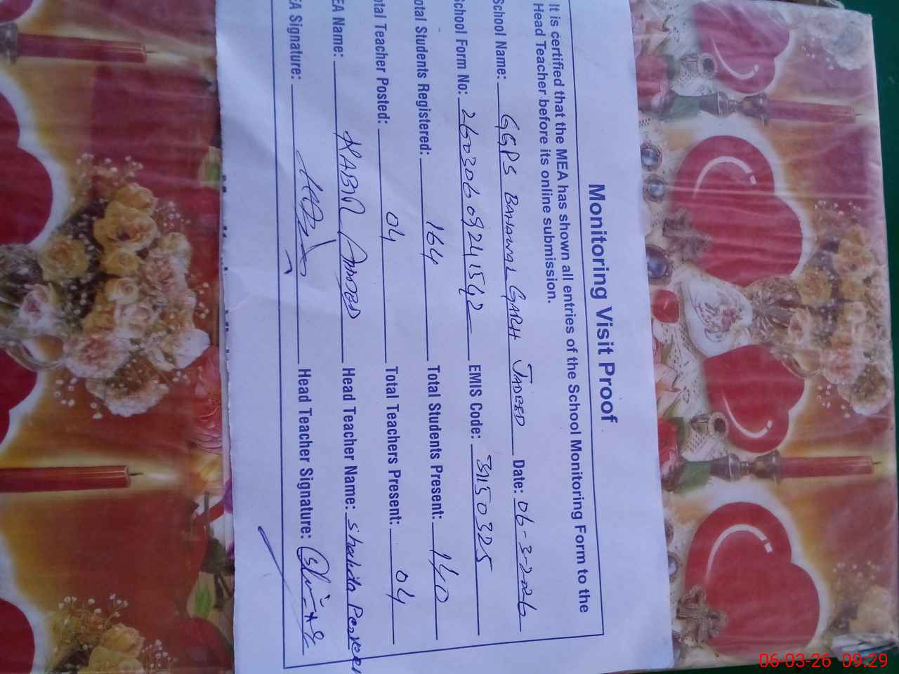 | Certified that this School was Inspected by the Undersigned MEA/DMO Today and the Information Stated Above is as Per Record. | |||||