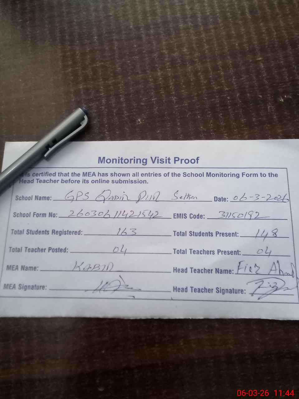 | Attendance Register | Head Teacher | MEA with School | Visit Proof |