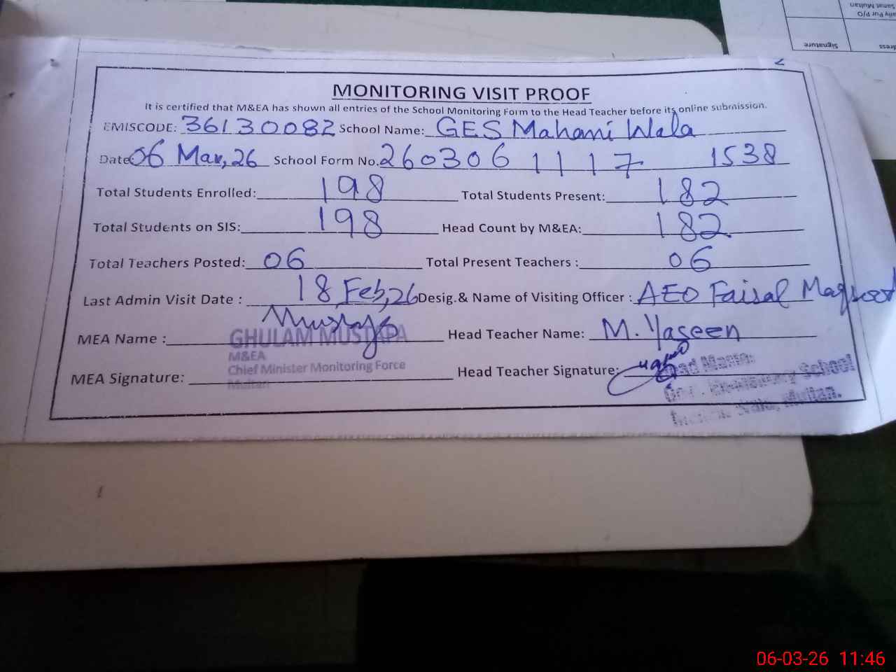 | EMIS Code: 36130082 | Name of School: GES MAHANI WALA MOZA CHATTA | |||
