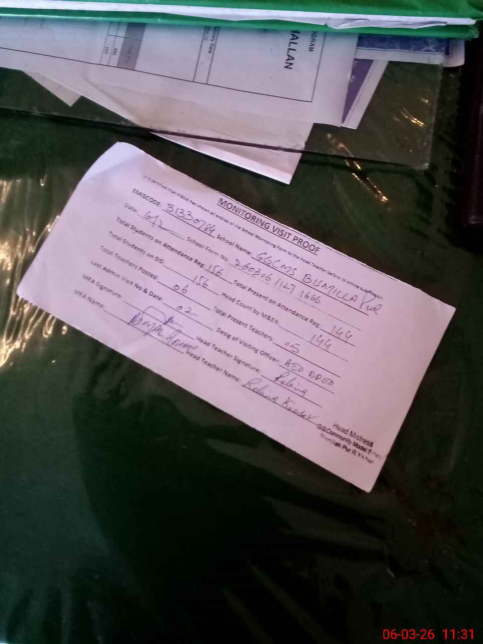 | Attendance Register | Head Teacher | MEA with School | Visit Proof |