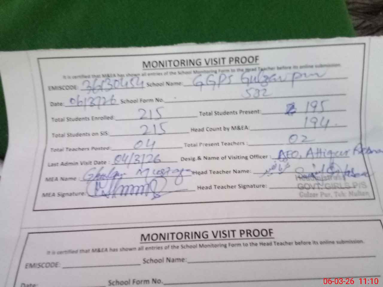 | Monitoring Date: 06-03-2026 | Start Time: 06-03-2026 10:39 AM | End Time: 06-03-2026 11:10 AM | Name of MEA: GH**** MU**** | |