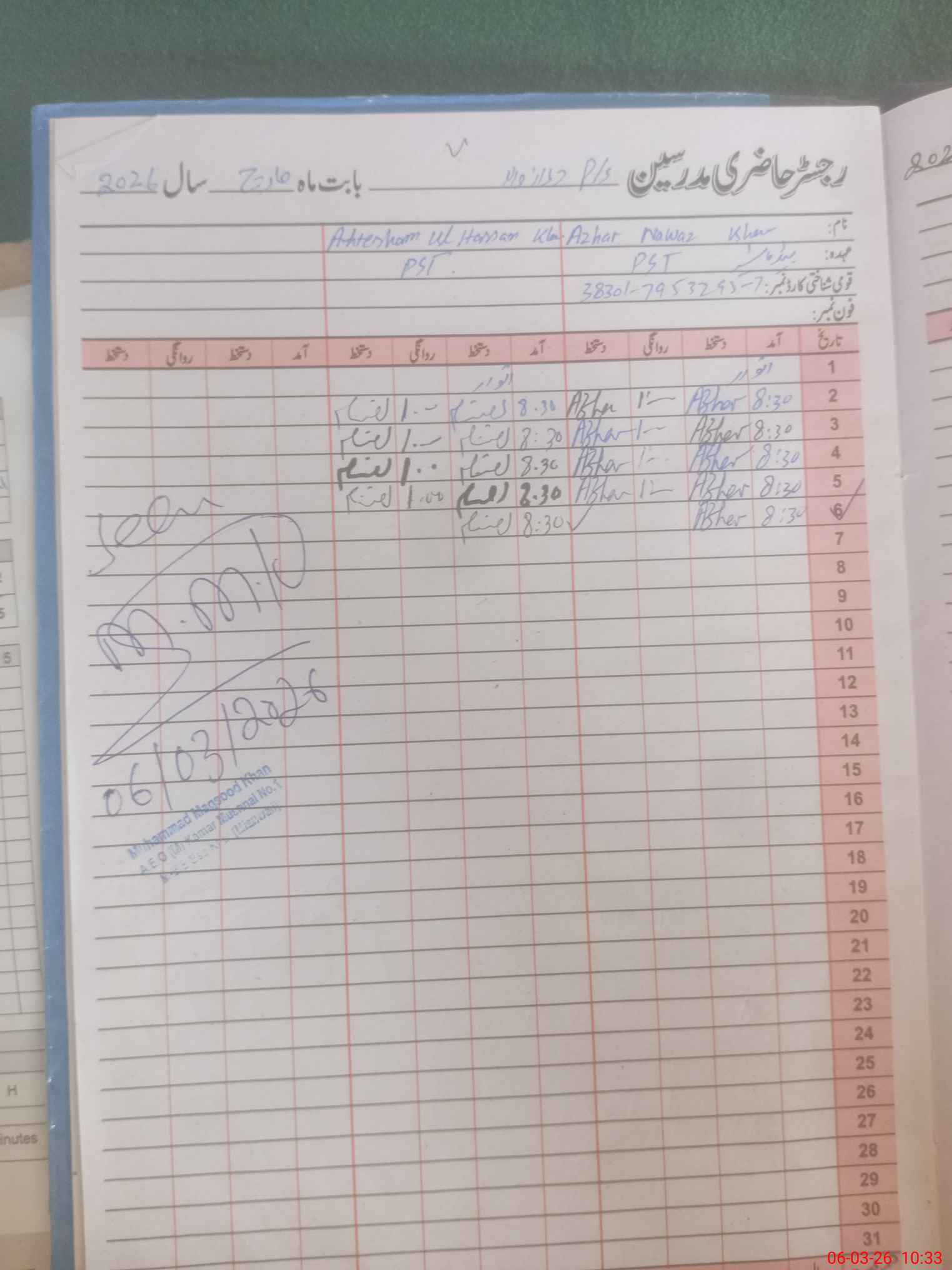 | Name: Az**** Na**** Kh**** Designation: (School Headmaster's/Headmistress's) PST Phone/Cell Number: 03**** |