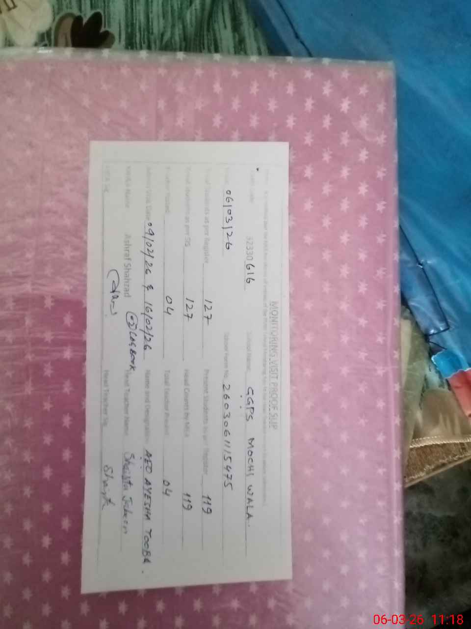 | Attendance Register | Head Teacher | MEA with School | Visit Proof |