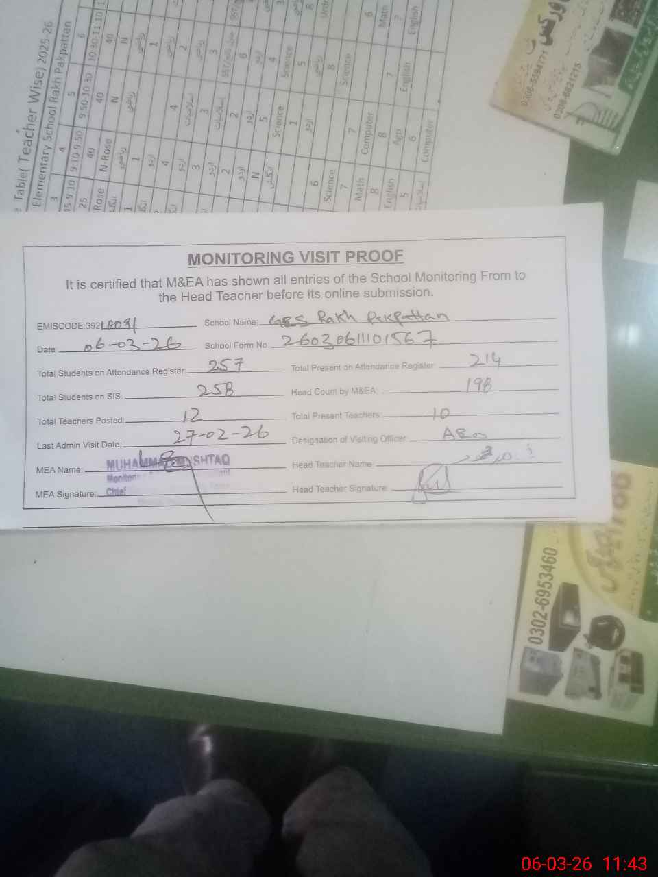 | Attendance Register | Head Teacher | MEA with School | Visit Proof |