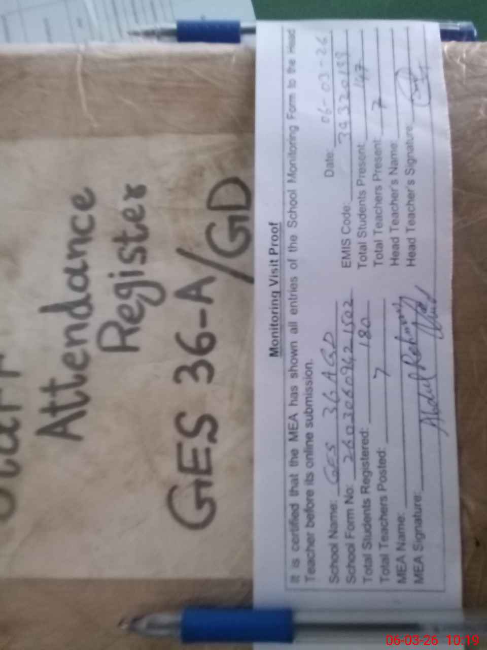 | Attendance Register | Head Teacher | MEA with School | Visit Proof |