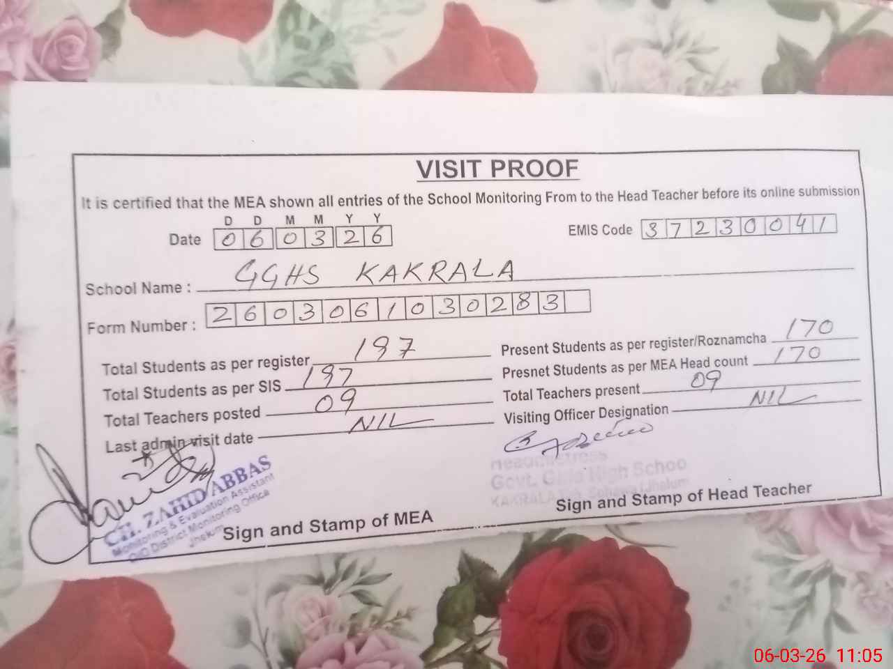 | Attendance Register | Head Teacher | MEA with School | Visit Proof |