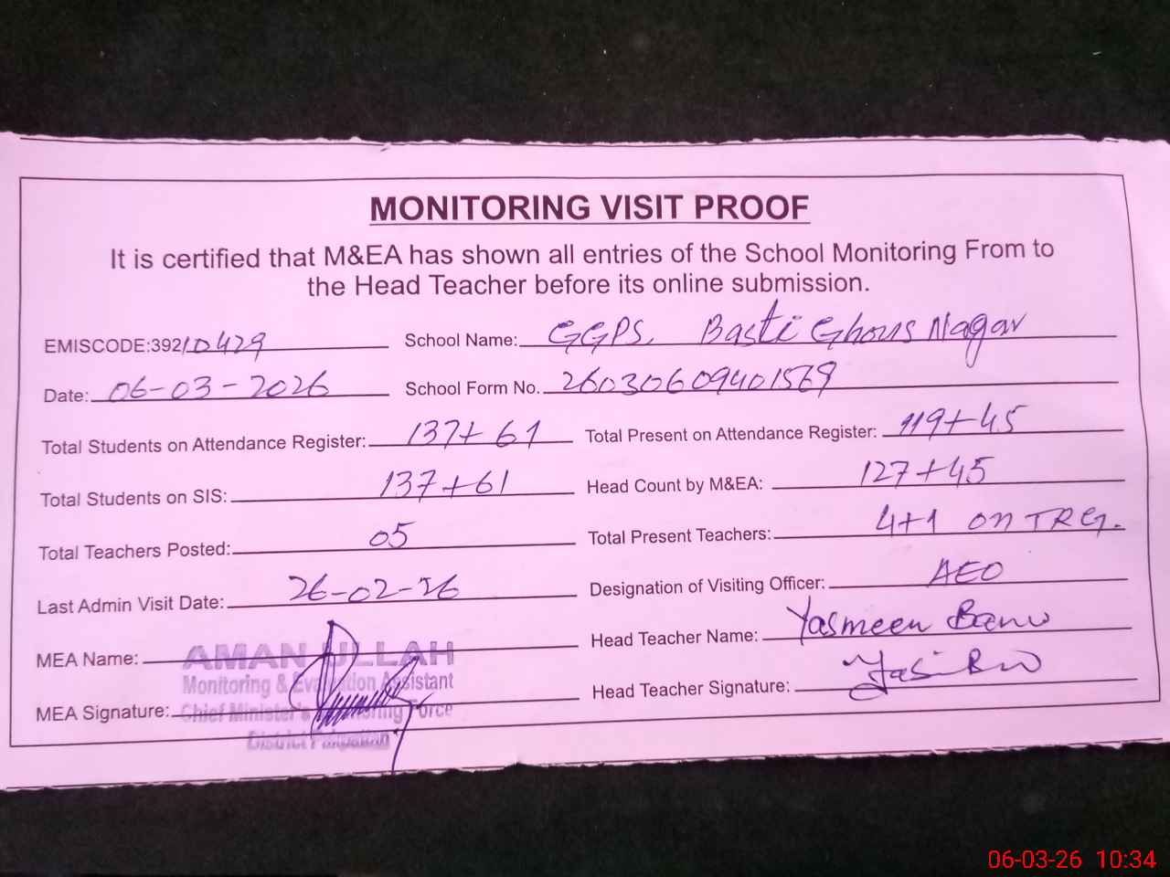 | Attendance Register | Head Teacher | MEA with School | Visit Proof |