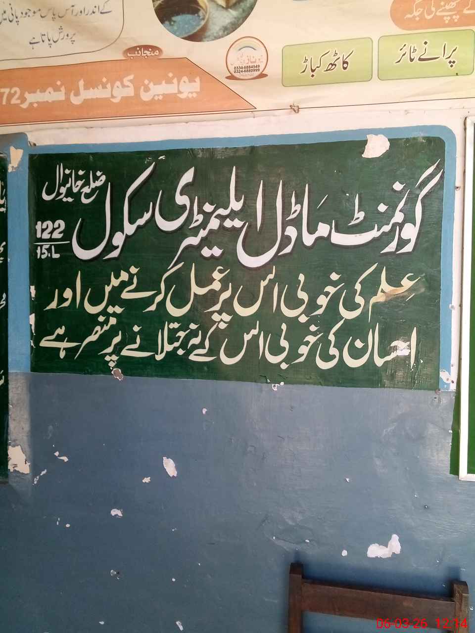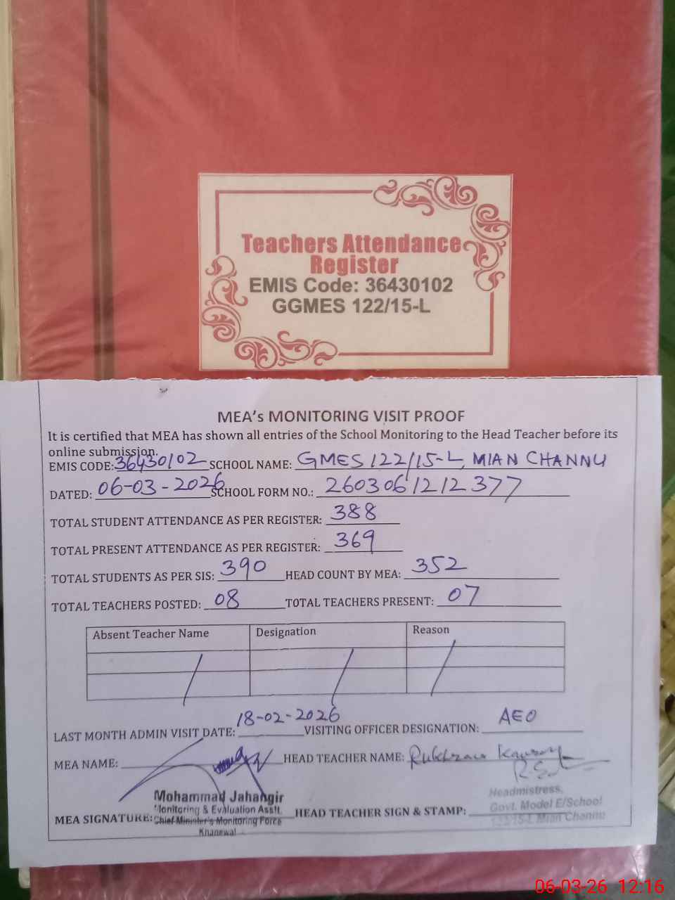 | EMIS Code: 36430102 | Name of School: GMES 122/15-L, MIAN CHANNU | |||