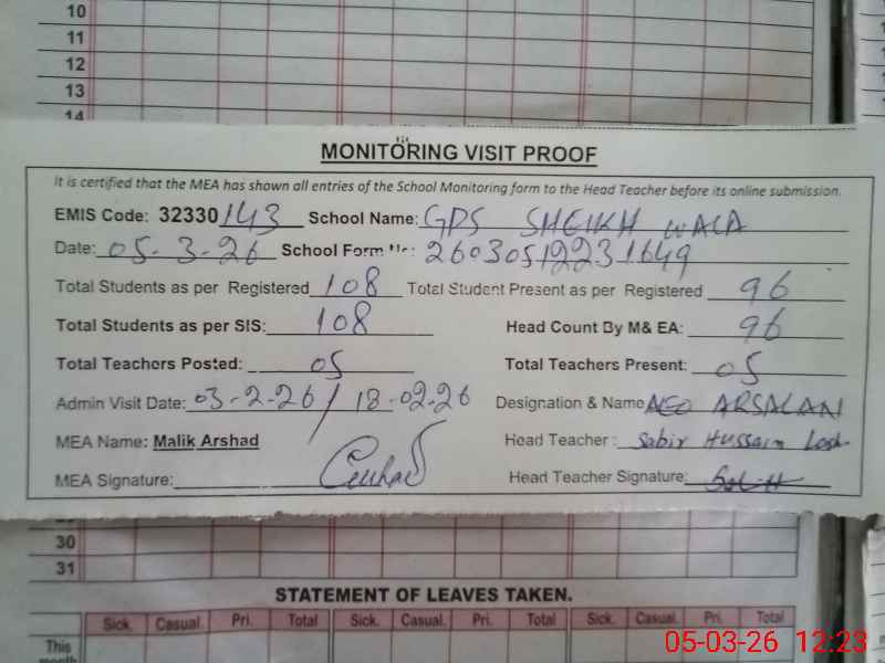 | EMIS Code: 32330143 | Name of School: GPS SHEIKH WALA | |||