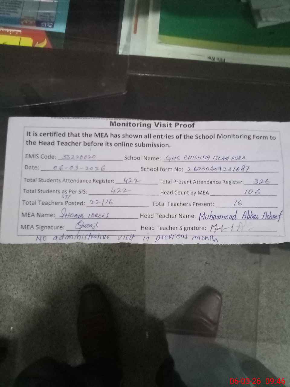| EMIS Code: 35220020 | Name of School: GHS CHISHTIA ISLAM PURA LAHORE CITY | |||