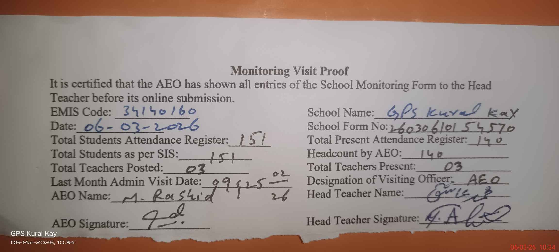| EMIS Code: 34140160 | Name of School: GPS KURAL KAY | |||