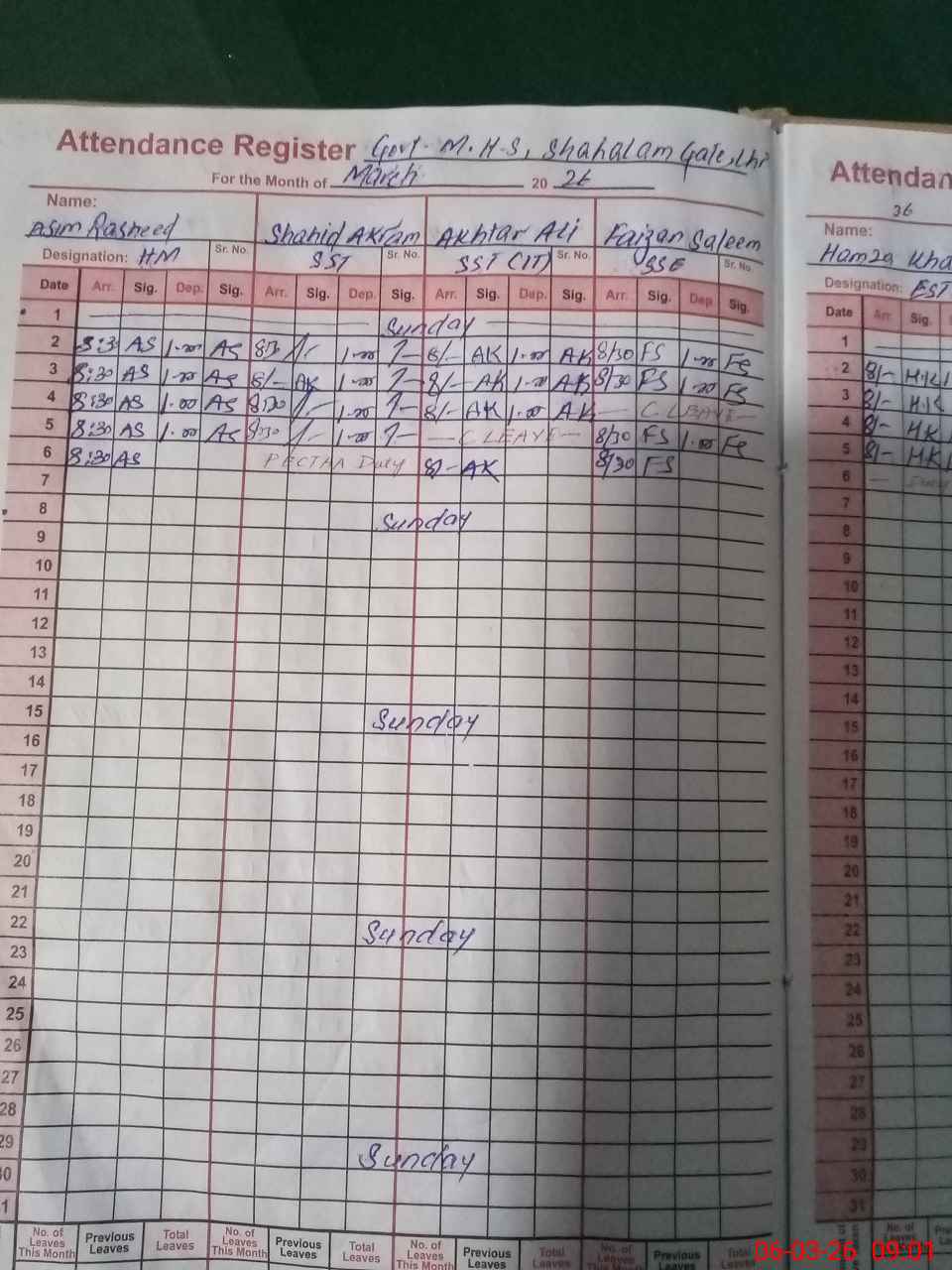 | Remarks (Use Separate Page if Required): 08 Teacher are on training of PECTAA Grade 8 Exam 2026 today | |||||