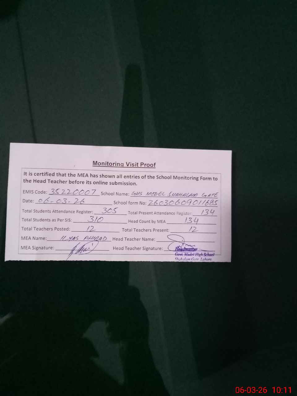 | Attendance Register | Head Teacher | MEA with School | Visit Proof |