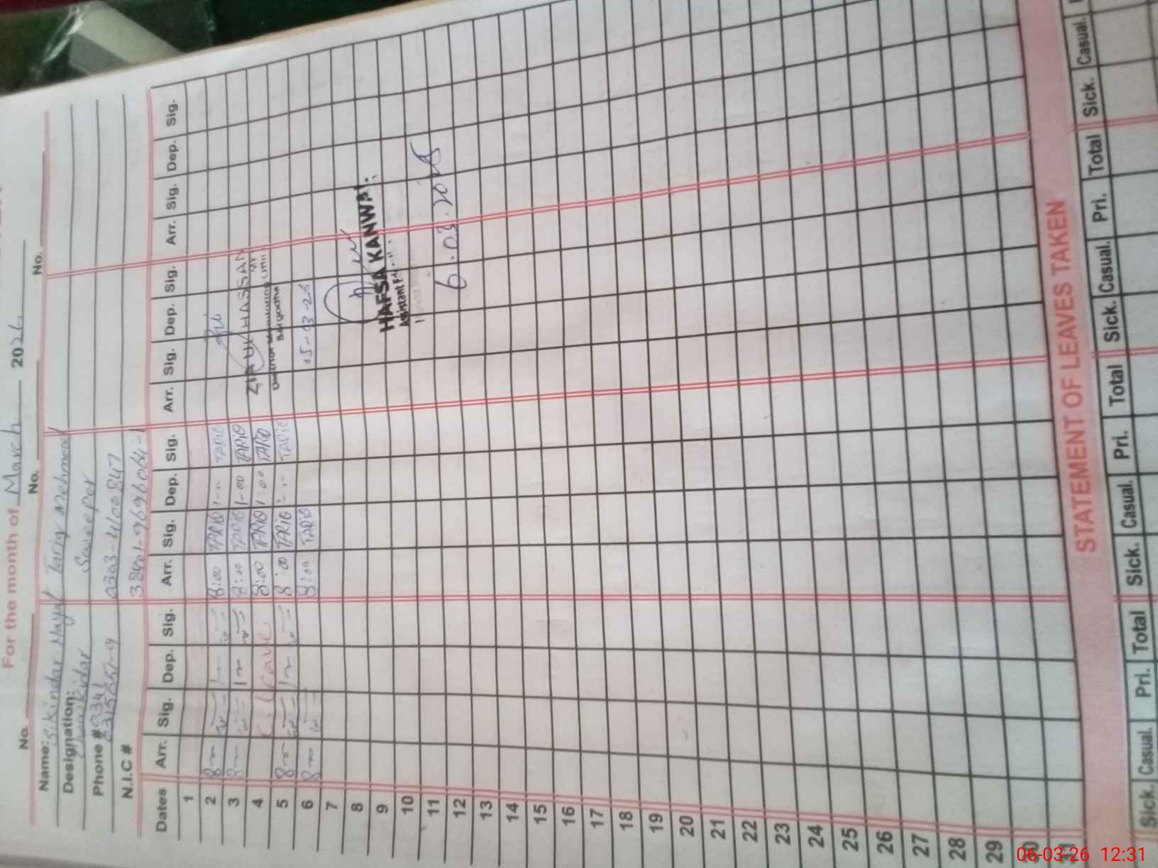 | CNIC | Full Name | Designation | R/C | Absence During Last Calender Month |