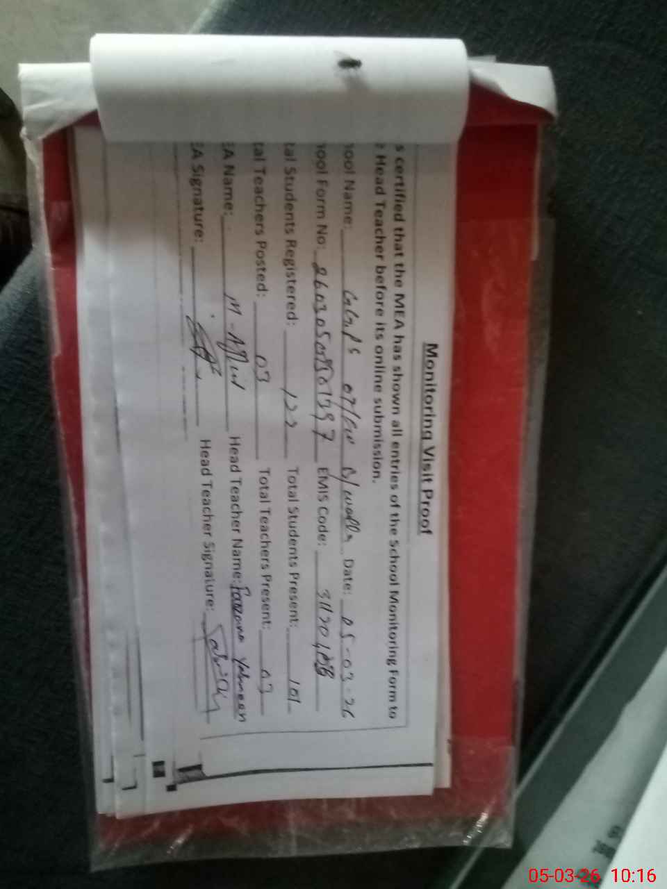 | Attendance Register | Head Teacher | MEA with School | Visit Proof |
