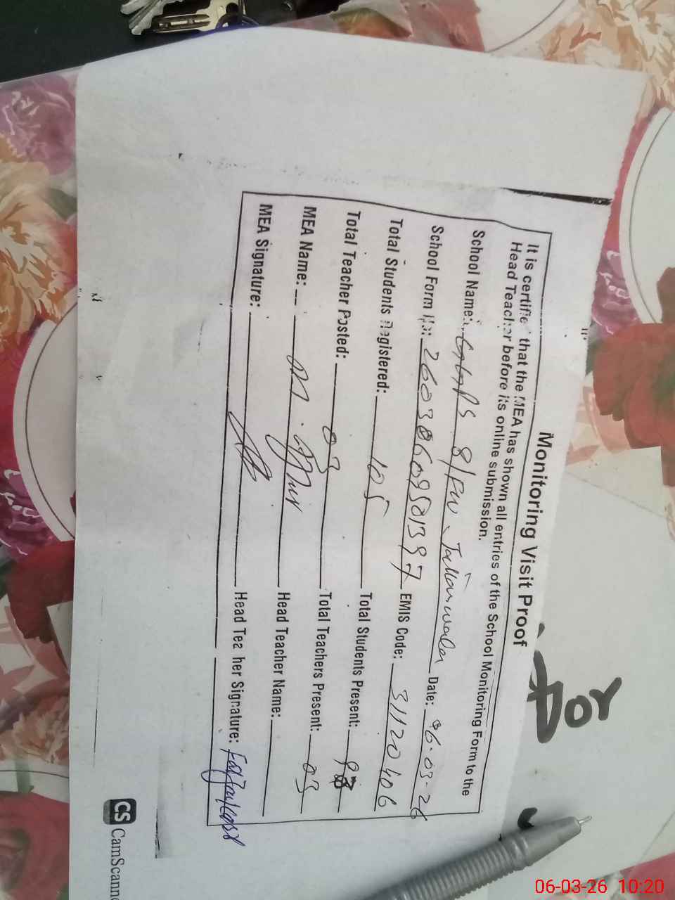 | Attendance Register | Head Teacher | MEA with School | Visit Proof |