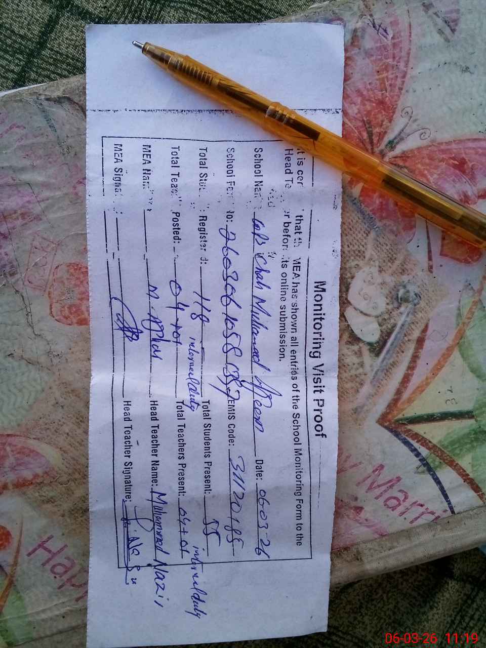 | Attendance Register | Head Teacher | MEA with School | Visit Proof |